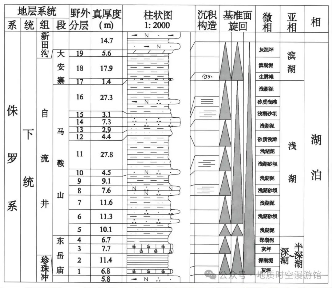 段:组的下一级岩石地层单位,正式命名的段需具有与组内相邻岩层明显不同的岩性特征,并分布范围广,代表组内具有明显岩性特征的一段地层。段可用地名加“段”来命名,也可用岩石名称加“段”命名,如綦江段、砂岩段等。自流井组划分为东岳庙段、马鞍山段和大安寨段。