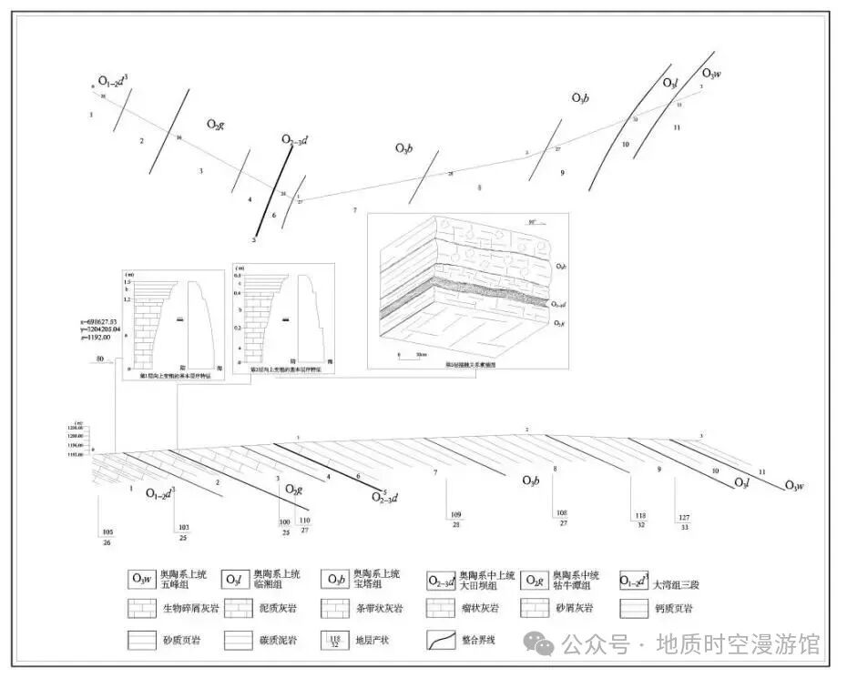 在野外地质工作中,岩石地层的识别和标志是最基本、最直接的工作。生物地层和年代地层都是在岩石地层工作的基础上进行的。生物地层通过对岩石地层进行连续化石标本采集,分析地层中产出的生物化石面貌,根据对化石标本的鉴定情况,建立若干个生物化石带。根据生物化石带的分布,以及岩石地层的对比,识别出地层的地质年代。而地层的绝对年龄,往往需要利用同位素才能确定。