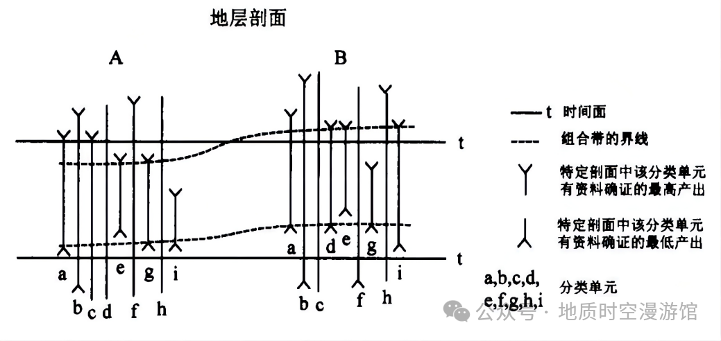 组合带:就像“生物全家福”,以一群共同出现的化石为标志,与相邻地层有明显区别。带的界线可划在标志该单位特征存在的生物面上。带的名称由2-3个最特征的分类单位名称联合单位术语组成,如Redlichiamurakamii(村上莱德利基虫)—Eoptychoparia(始褶颊虫)组合带。