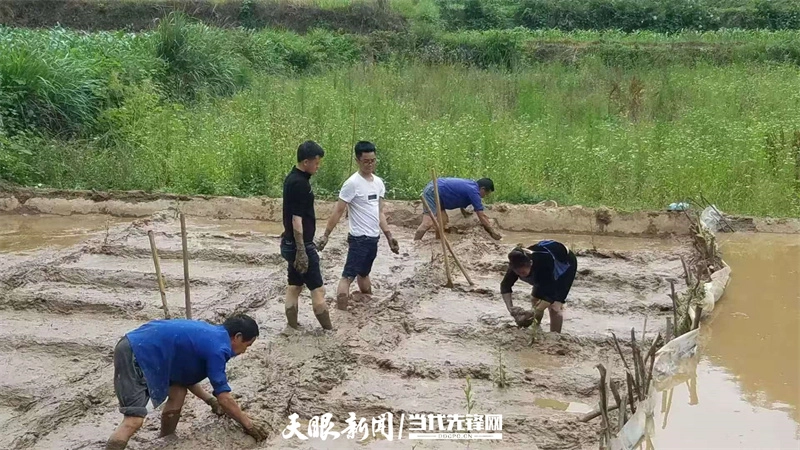 地质技术人员与当地农户修整田埂。