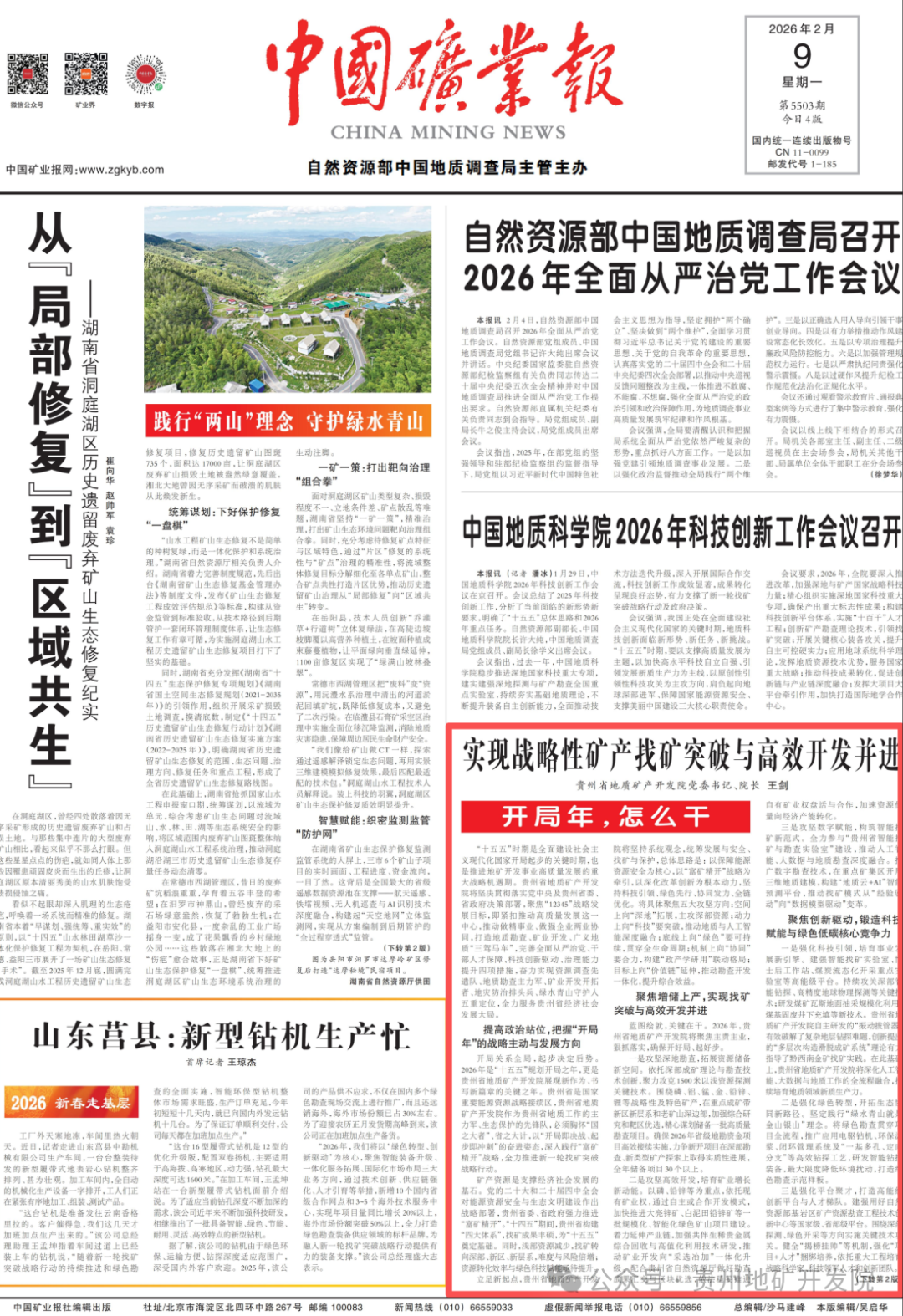 2月9日,《中国矿业报》头版专栏刊发省地矿院党委书记、院长王剑同志署名文章《实现战略性矿产找矿突破与高效开发并进》。现予全文刊发。