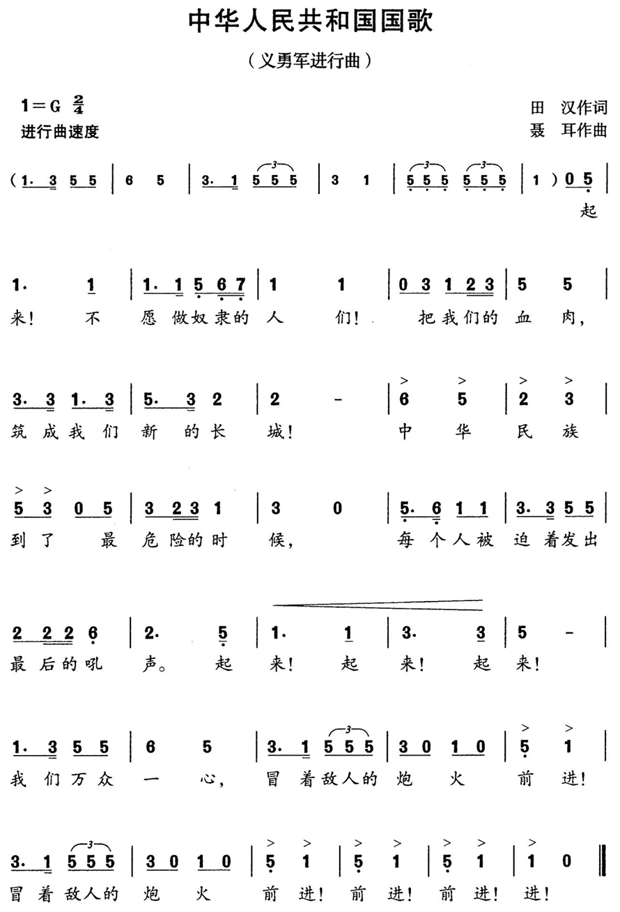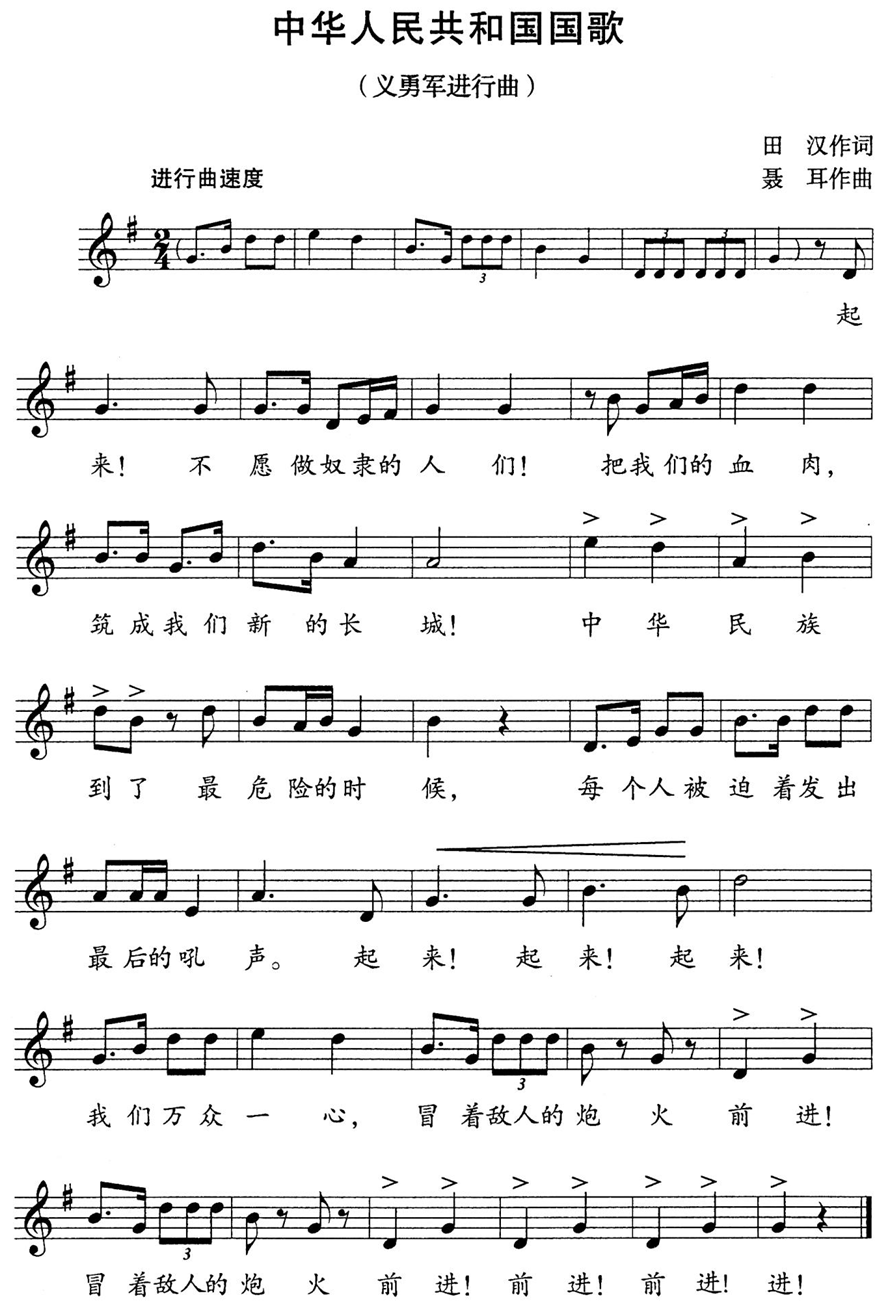 (2017年9月1日第十二届全国人民代表大会常务委员会第二十九次会议通过) 第一条 为了维护国歌的尊严,规范国歌的奏唱、播放和使用,增强公民的国家观念,弘扬爱国主义精神,培育和践行社会主义核心价值观,根据宪法,制定本法。 第三条 中华人民共和国国歌是中华人民共和国的象征和标志。 (一)全国人民代表大会会议和地方各级人民代表大会会议的开幕、闭幕; 中国人民政治协商会议全国委员会会议和地方各级委员会会议的开幕、闭幕; (五)各级机关举行或者组织的重大庆典、表彰、纪念仪式等; 第五条 国家倡导公民和组织在适宜的场合奏唱国歌,表达爱国情感。 第六条 奏唱国歌,应当按照本法附件所载国歌的歌词和曲谱,不得采取有损国歌尊严的奏唱形式。 第七条 奏唱国歌时,在场人员应当肃立,举止庄重,不得有不尊重国歌的行为。 第八条 国歌不得用于或者变相用于商标、商业广告,不得在私人丧事活动等不适宜的场合使用,不得作为公共场所的背景音乐等。 第九条 外交活动中奏唱国歌的场合和礼仪,由外交部规定。 第十条 在本法第四条规定的场合奏唱国歌,应当使用国歌标准演奏曲谱或者国歌官方录音版本。 外交部及驻外外交机构应当向有关国家外交部门和有关国际组织提供国歌标准演奏曲谱和国歌官方录音版本,供外交活动中使用。 国务院体育行政部门应当向有关国际体育组织和赛会主办方提供国歌标准演奏曲谱和国歌官方录音版本,供国际体育赛会使用。 国歌标准演奏曲谱、国歌官方录音版本由国务院确定的部门组织审定、录制,并在中国人大网和中国政府网上发布。 中小学应当将国歌作为爱国主义教育的重要内容,组织学生学唱国歌,教育学生了解国歌的历史和精神内涵、遵守国歌奏唱礼仪。 第十二条 新闻媒体应当积极开展对国歌的宣传,普及国歌奏唱礼仪知识。 第十三条 国庆节、国际劳动节等重要的国家法定节日、纪念日,中央和省、自治区、直辖市的广播电台、电视台应当按照国务院广播电视主管部门规定的时点播放国歌。 第十四条 县级以上各级人民政府及其有关部门在各自职责范围内,对国歌的奏唱、播放和使用进行监督管理。 第十五条 在公共场合,故意篡改国歌歌词、曲谱,以歪曲、贬损方式奏唱国歌,或者以其他方式侮辱国歌的,由公安机关处以警告或者十五日以下拘留;构成犯罪的,依法追究刑事责任。附件:中华人民共和国国歌(五线谱版、简谱版)